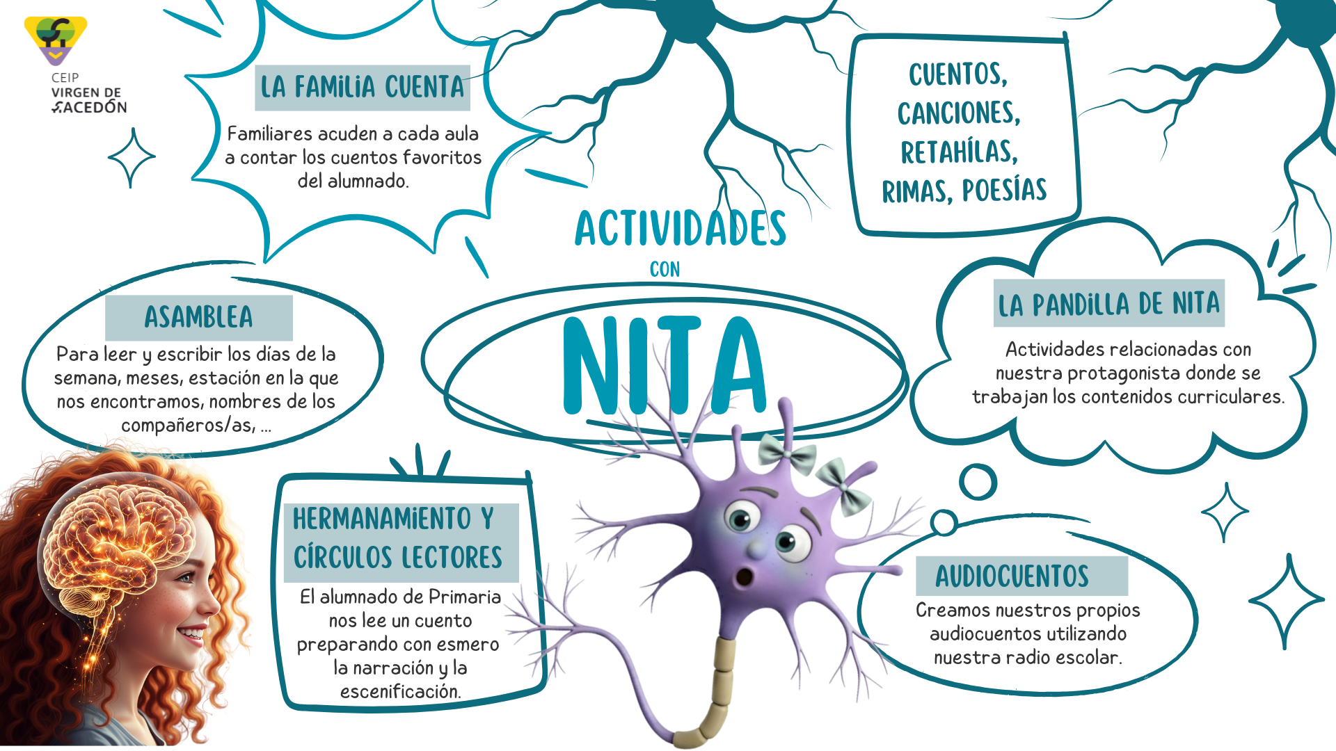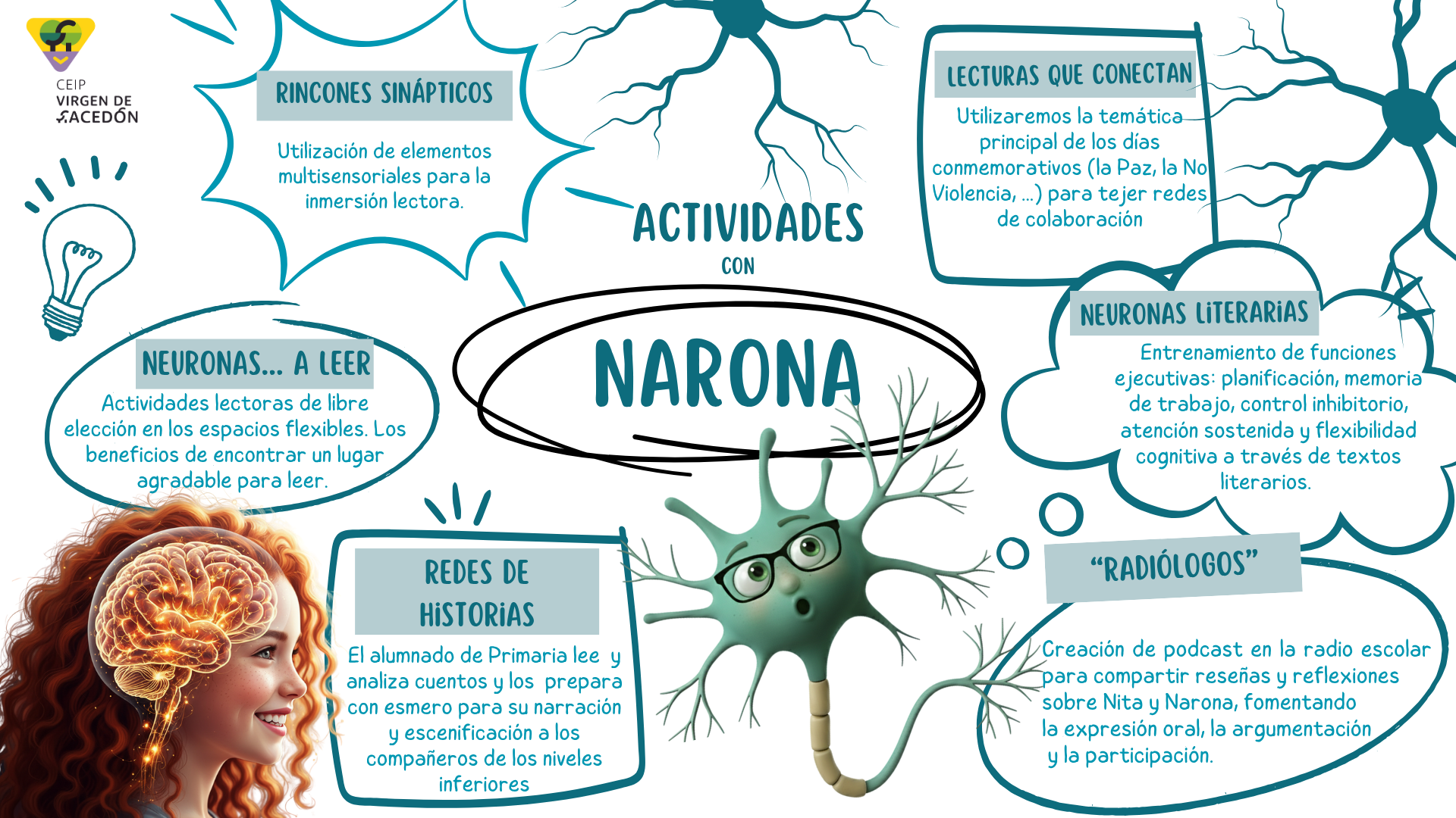 Este proyecto nace con la intención de formar lectores activos, críticos y sensibles, capaces de interactuar con los textos, con los demás y consigo mismos. La historia de Nita y Narona no es solo un punto de partida motivador, sino un símbolo: representa el reto educativo actual de despertar cerebros adormecidos por el exceso de estímulos digitales y devolver a la lectura el papel que ha tenido como motor del pensamiento, la empatía y la creatividad.